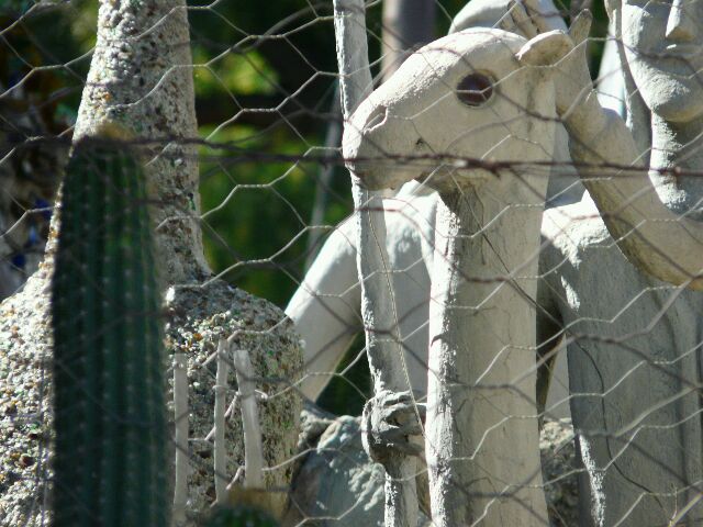 We will overnight in Nieu Bethesda, a one donkey town in the Eastern Cape. It is famous entirely due to the obsession of Helen Martins, an artist of dubious merit. She embarked on a project to fill her property with concrete sculpturess. Owls, camels and people and stuff. All set out in scenes that made sense to her. The job completed in her 70's, she committed suicide. The road led us through the Small Karoo into the Karoo proper. 90km to Uniondale. Then 110km Willowmore. And so on through vast expanses of nothing. The very nothingness in time becomes peculiarly charming. A connection to an ancient land.