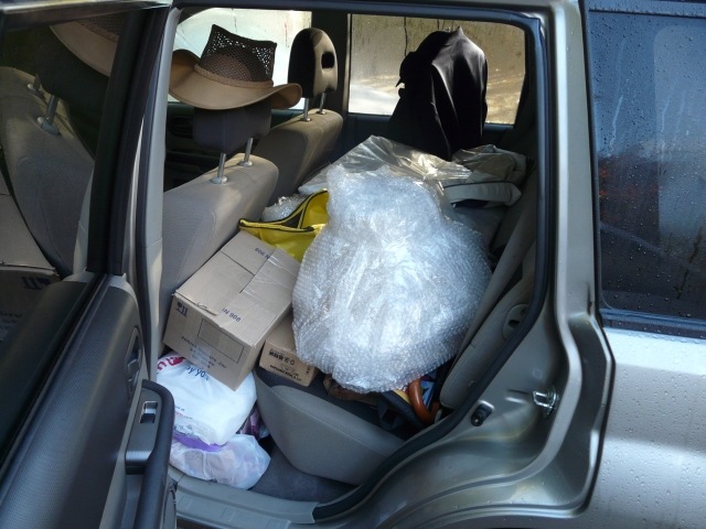 A thoroughly boring and, in terms of civic neglect, a thoroughly depressing drive. It seemed to take forever, but we did eventually reach Hogsback. Which deserves its own fresh blog. Tomorrow or so. I am suspicious. Anna is capable of far more sneakiness than I have up to now suspected. When Thys said "What is all this stuff on the back seat?", I realised that we now effectively have a two seater XTrail. The back seat area is filled halfway to the roof with stuff. The woman has sneaked through my guard and slyly did a slow accumulation of stuff. There is enough in the car to stock a stall at the market. A large stall. How could I have been so naive? Tee-hee!!!! I have been informed that I exaggerated the state of the car's back seat. That it is, in fact, only covered with a thin layer of stuff. I pride myself on the fact that this blog purveys the truth, only the truth and the whole truth. I lay before you hard evidence regarding said motor vehicle's back seat.