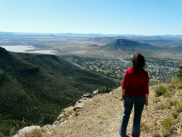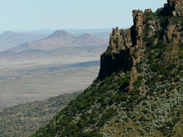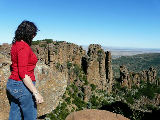 Off to Graaf-Reinet, where we intended staying one night. Sufficient time to see whatever GR, as we old hands call it. has to offer. Graaff-Reinet was founded in 1786 by Governor van de Graeff. He either really loved his wife, Reynet, or added her name to the town to get out of a tough spot. In any event, this makes the place really, really old in South African terms. We generally regard anything that existed before tv as ancient. On that scale Graaff-Reinet is practically prehistoric. The town lies in the middle of the Camdeboo National Park. We noted when passing through on the way to NB, that it is also home to the Valley of Desolation. So, off to the Camdeboo Park we went. And to the Valley of Desolation. Sounds sort of hellish, doesn't it? "Sally, if you do not eat your pumpkin, I will send you to the Valley of Desolation." Just before the actual Valley- at its portals, one may say, is a lookout point. Where one can look out.