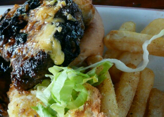Lunch was obtained in a vine-coveted courtyard at the back. Burger pour moi and quiche for her.