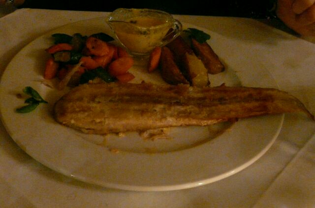 Off to dinner. The place boasts 5 zillion eateries, most of which were closed on Tuesday. Probably to recover from feeding the hordes over the long weekend. Fortunately Clementines, highly recommended by all and sundry, was open for business, so thither we went. The wine was good, the food less so. In fact, bad enough that we refused to pay for it. Anna had what was touted to be a sole thermidor. She got a tired old fish with a small bowl of bechamel sauce on the side.