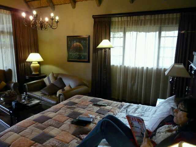 The attentive reader will have noticed that the Innkeeper has very astutely steered the trip wide of curios, leather goods and carvings of all descriptions. I am not going to go out without a fight and have plans of my own. We shall see. Hah! Indeed we hall.... Our second day at the Cathedral Peak Hotel was packed with activity. Such as eating breakfast. And reading in the pub.