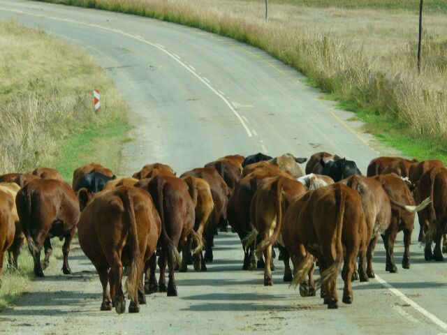Not sure what the morrow will bring. Bound to be interesting, though. We noticed that the road from Nottingham Road to our lodge was splotched with brown stains. Peculiar. Until we realised that the road must have been built on an ancient pathway. This was when we experienced the migration of the cattle. Swaying along in the road, chewing the cud and contemplating life's small puzzles. As: When should I drop the next load of poo? Wait, wait - here's a nice clean piece of road. Let her rip, baby! Splosh! Very rural and charming. To get the animals out of the way was like parting the Red Sea. Surrounded by cows, squishing through the poo, one proceeds very slowly. The cows don't care - the murmur of the engine probably just sounds like other cows farting.